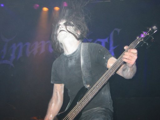 Up last was Immortal. I had seen them once previous, in daylight, at Waldrock 1999. I was not impressed, in fact I thought they were a bunch of lunatic posers who made mediocre music. Abbath’s ridiculous phallic thrusts and the cliché fire-breathing act launched them right into my top-something-or-other of Bands Not To Be Taken Seriously. Then they released "Damned in Black" (which many people consider their "sell out effort"). The album grew on me and it’s one of my favourite black metal albums of recent years now. I was glad to hear the band kicking off with "Damned in Black", after which at least another two tracks from that album were played (including, I believe, "Triumph"). I do not have vast knowledge of their earlier albums, but an Immortal fan I talked with told me they concentrated on their recent albums (I don’t have "Sons of Northern Darkness" yet…) and only played "Battles in the North" from their older material. He was a bit disappointed. I, however, had great fun. Immortal really are quite good live, and Horgh is a drummer that’s right up there with Nicholas Barker. Unfortunately, Immortal’s gig was of such quality that it involved massive crowd movements, reversely proportional to yours truly’s photo opportunities. Obviously I wanted Abbath, but I only managed to get their new bass player (name unbeknownst to me).