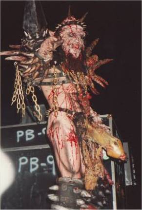 On the far side two people were sitting, playing a board game unknown to me and involving six-cornered tiles on the board and a lot of small cardboard bits. To my left sat a stringy guy wearing an RKL T-shirt and army boots with red-stained socks in them, red-stained hands and short hair combed back. He turned out to be Gwar's 'manager', Sleazy P. Martini, generally represented on stage as a dude with tight purple or black polyester clothes, platform shoes, a Presleyesquely exaggerated hairdo and a ridiculously big dollar sign collarred around his neck. Two other guys walked in, interested in seeing what was going on, who turned out to be Sexecutioner (co-vocalist) and Jizmak da Gusha (drummer). They sat down on the opposite side of a Jackson guitar case on which I put down my recording equipment as I started the interview.