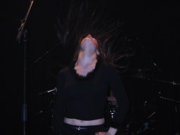When Tanzwut took to the stage, the first reaction was one of mirth. A couple of guys with bagpipes, all of them dressed in semi-mediaeval garb (including brown leather skirts and dresses), lead by a vocalist who'd attached devilish horns to his bald pate. So far they looked like a toned-down, culture-shocked version of Gwar. Then they started playing. Initially I have to confess there were some compatibility problems with me and their dance beats, as well as their singing in German. Before and since Marianne Rosenberg ("Ich Bin Wie Du", 1976) I have not been capable of appreciating any form of German-language music. The beauty of German's cases never struck me, Goethe to me was just a guy babbling in a language fit only to shout hysterically at impressionable mid-20th-century would-be boyscouts and armies with.