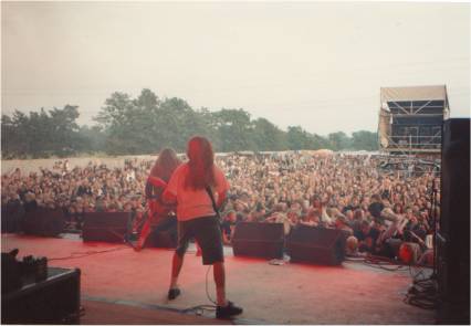Obituary was one of the bands to perform at Wâldrock, July 9th 1994. The day was progressing. It had rained some time earlier but the whole rest of the day seemed to promise dry and sunny weather. 'Backstage' is actually far too ornamental a word for the mess behind the large stage. Basically it was a farmer's backyard filled with parked cars, Trans Am Trucking vehicles and tour vans, between which some people (primarily members of Anathema) kicked around a soccer ball and other ambled around nervously in search of something or other. Rather deep trenches had formed themselves where heavy trucks had ploughed through the sodden earth - a perfect place to sprain your ankle.